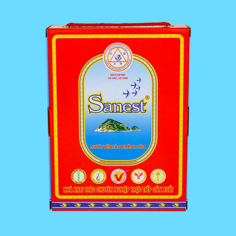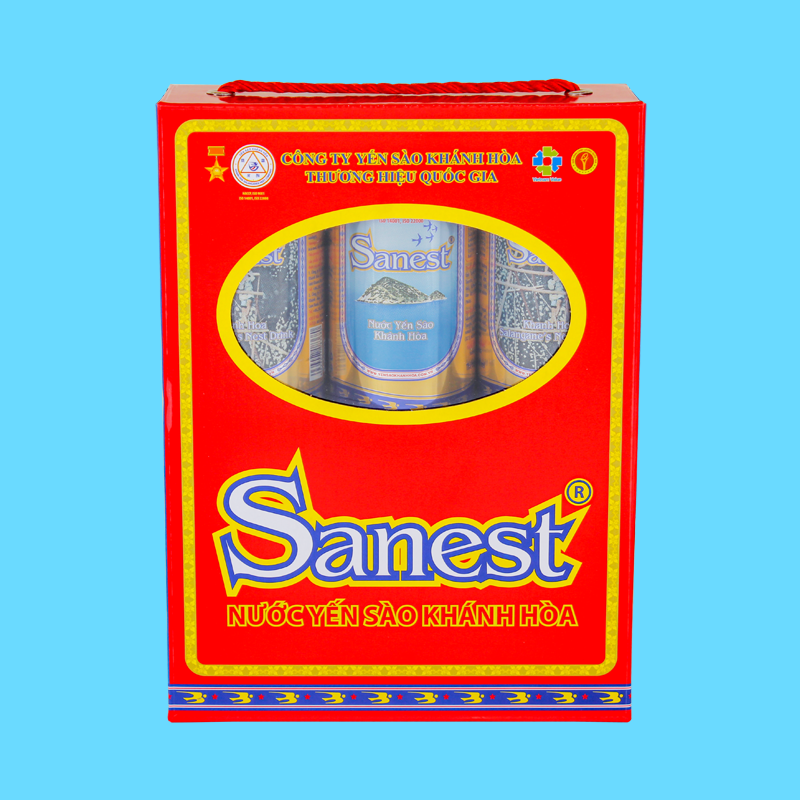 * Nước Yến sào Khánh Hòa Sanest hộp 6 lon 190 ml QT: 1,4 kg; D x R x C = 32,25 x 5,6 x 20 (cm).